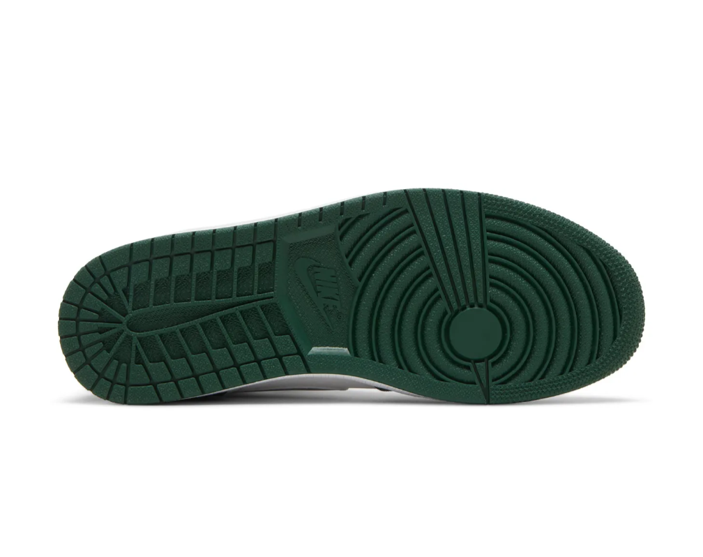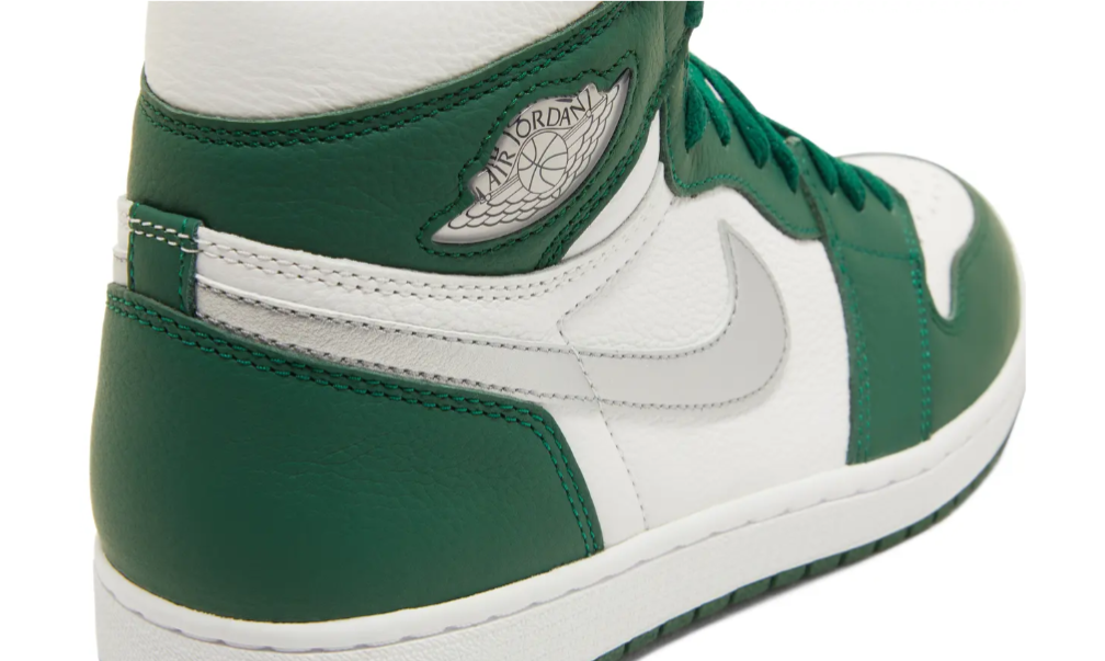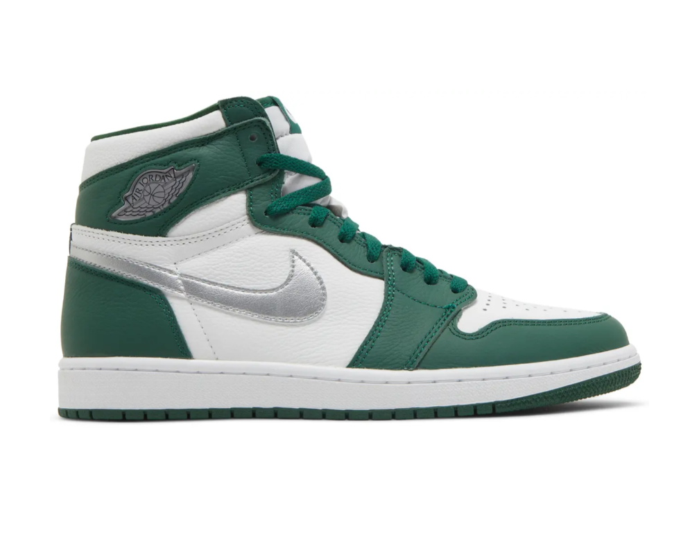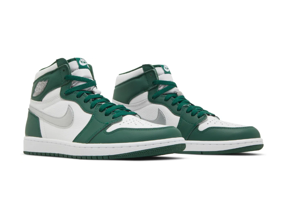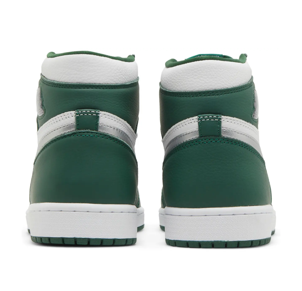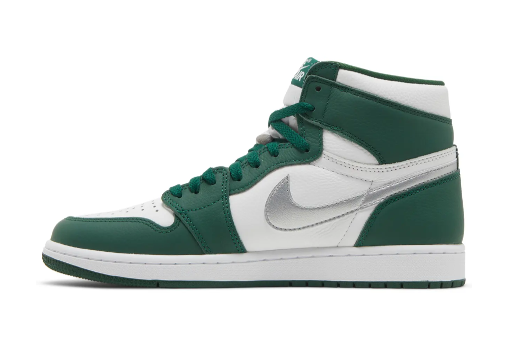 The Air Jordan 1 Retro High OG ‘Gorge Green’ features color blocking reminiscent of the iconic Air Jordan 1 CO.JP ‘Midnight Navy,’ originally released in 2001 and reissued in 2020. The high-top carries a tumbled leather upper that pairs a white base with forest green overlays at the forefoot and heel. Branding elements include a metallic silver Swoosh and a jeweled Wings logo on the lateral collar flap. Underpinning the sneaker is a rubber cupsole, highlighted by encapsulated Air-sole cushioning and a green rubber outsole.