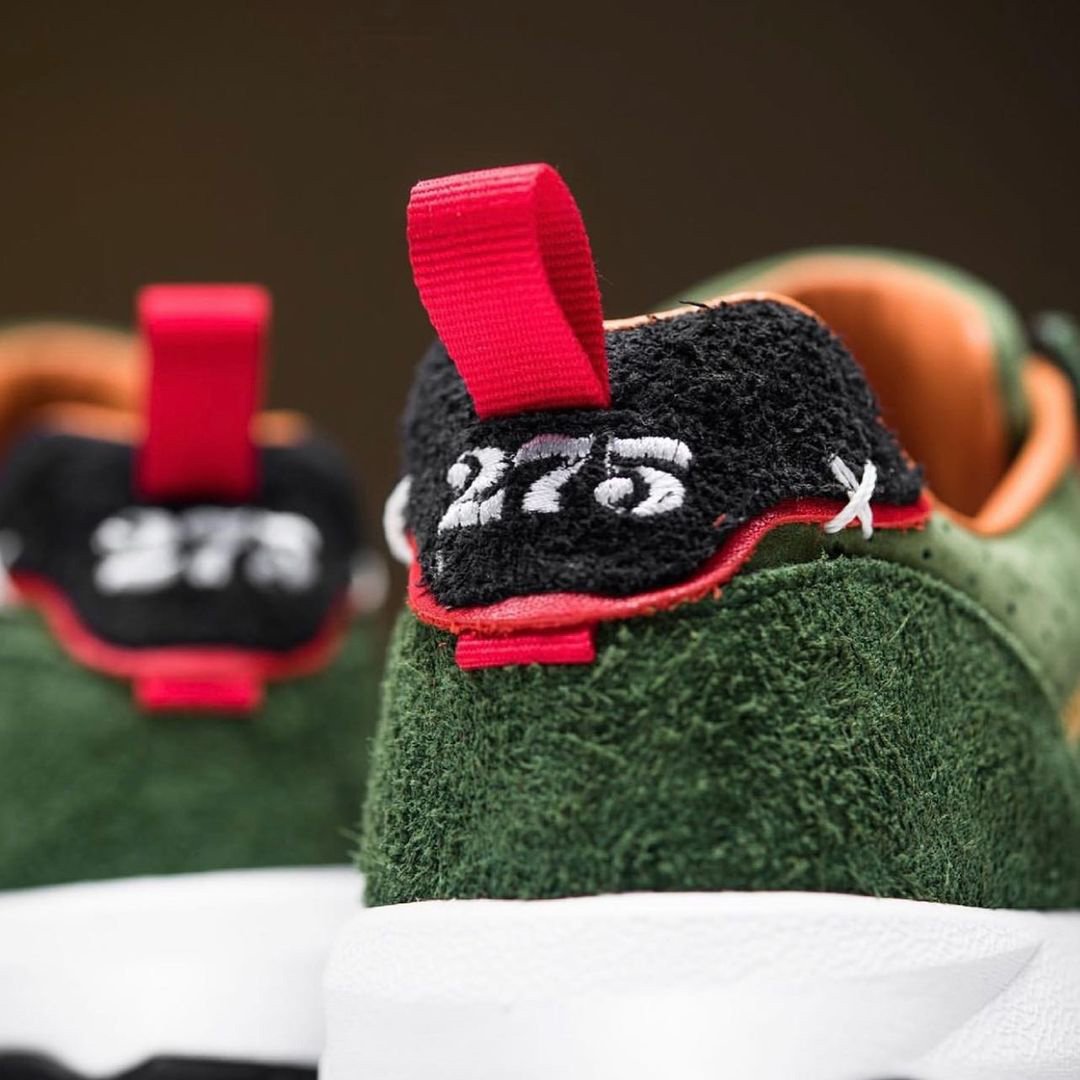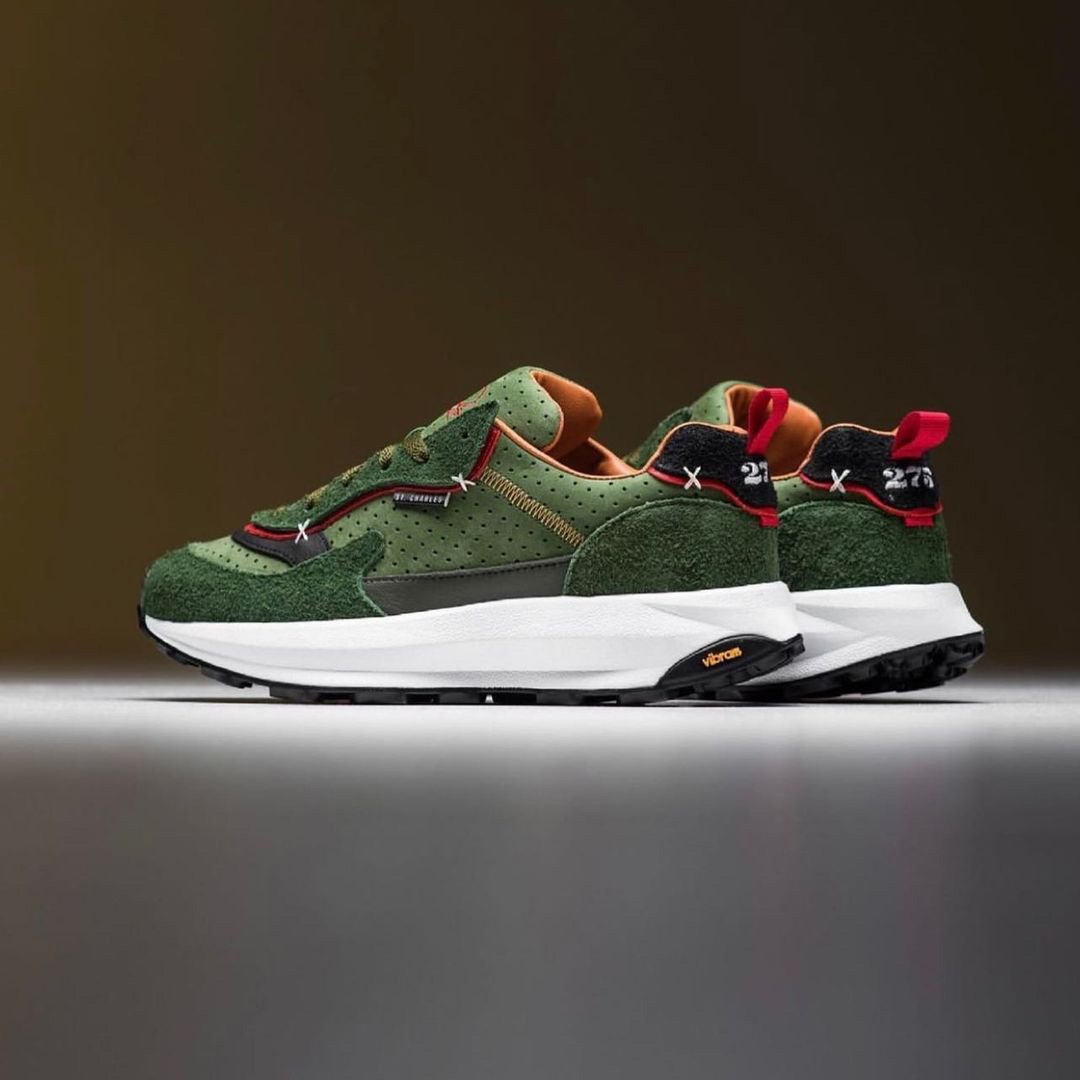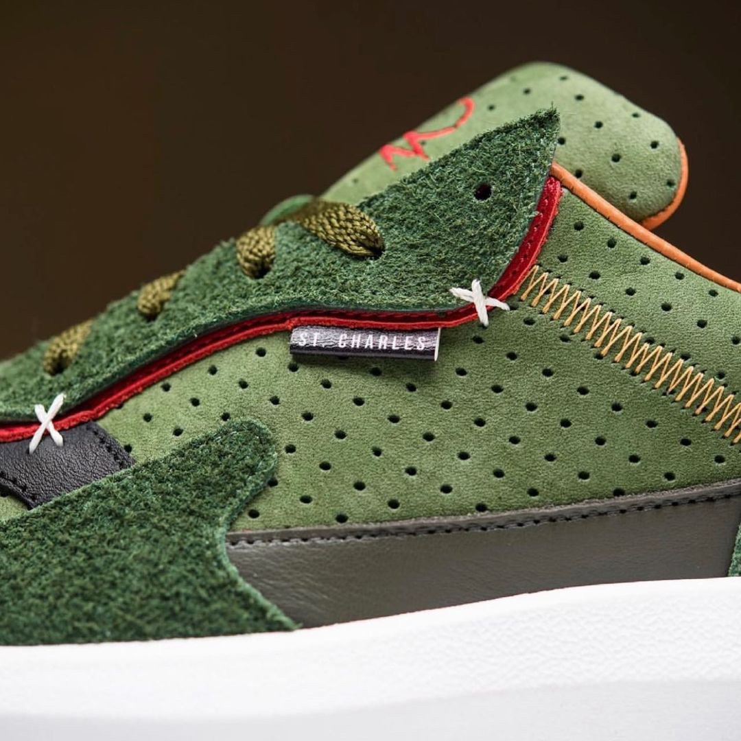The upper is dressed in an olive perforated suede with overlays in black and red leather and long-haired olive suede. Contrast stitching is seen on the overlays and quarter panel, with a “St. Charles” tag stitched underneath the lace overlays. “275” is stitched on the black heeltab with a red pulltab for ease of access, and a tan leather liner finishes up the upper. The white midsole is a foam Vibram midsole with a black Vibram outsole for ultimate durability and traction.