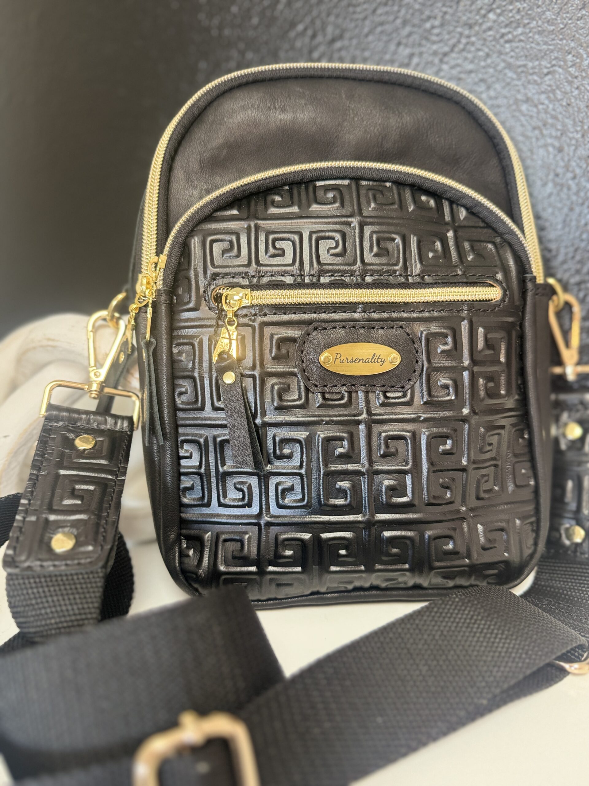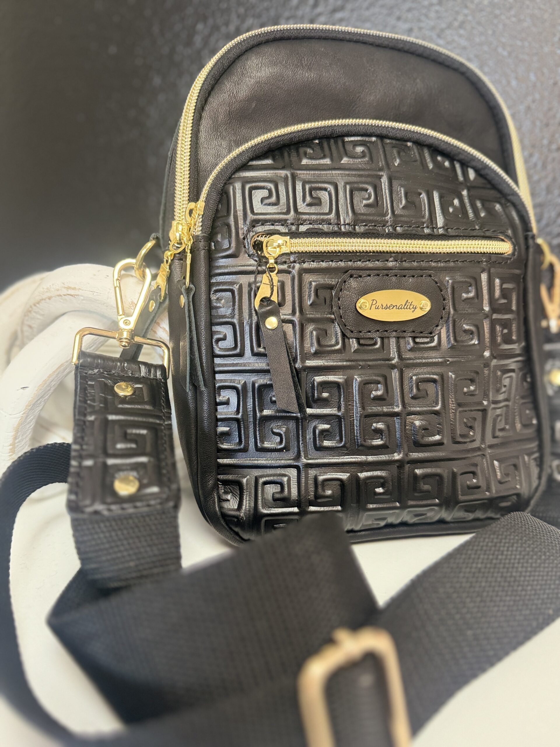 Elevate your everyday look with the chic Pursenality Handmade Labyrinth Tooled Leather Crossbody Bag. Handcrafted from sleek black leather, this compact yet spacious bag features a distinctive embossed geometric pattern and eye-catching gold-tone hardware, including a prominent "Pursenality" emblem. Designed for comfort and convenience, its adjustable strap allows for versatile wear as a crossbody or shoulder bag, perfect for keeping your essentials secure and stylishly organized on the go.