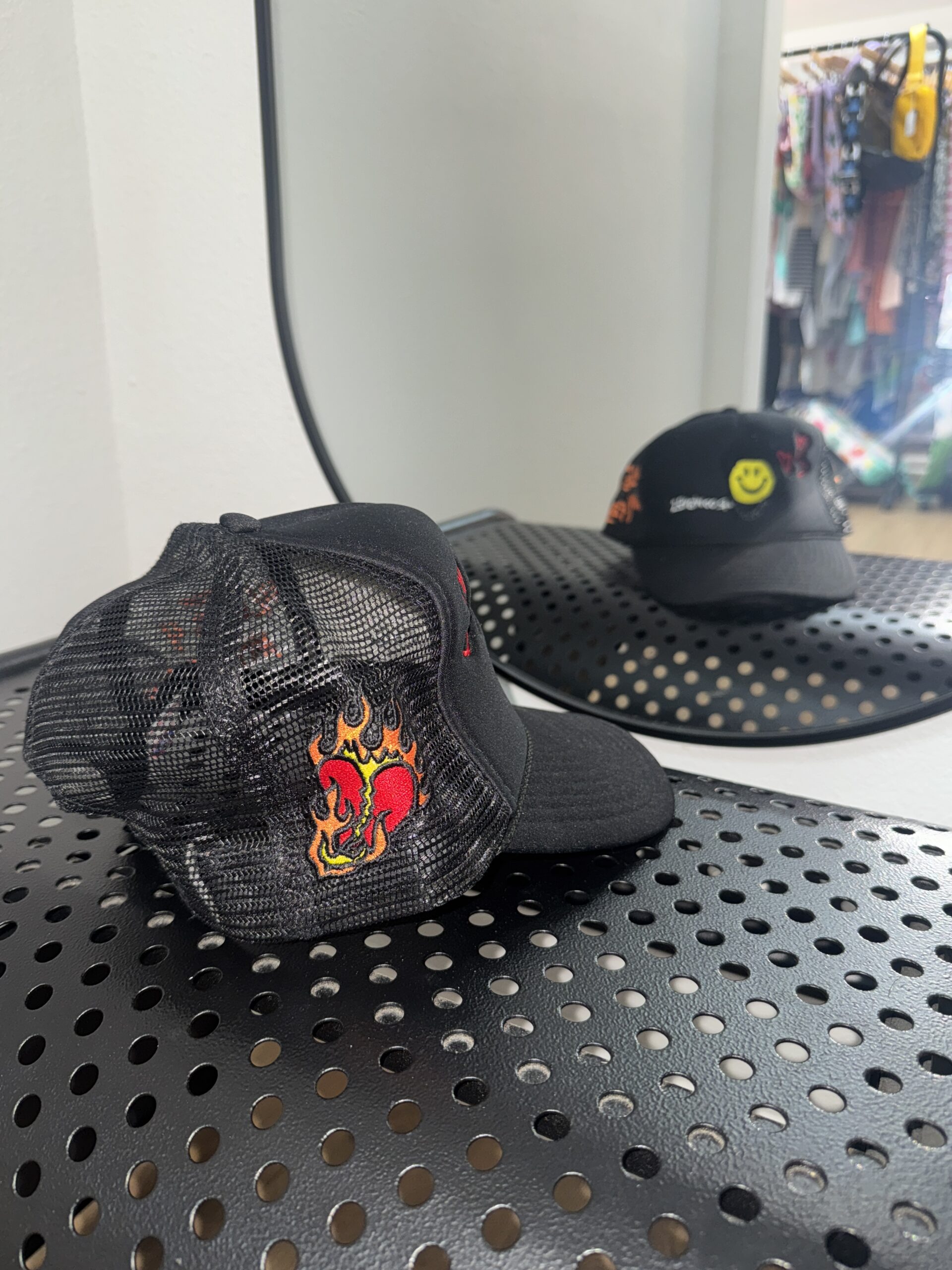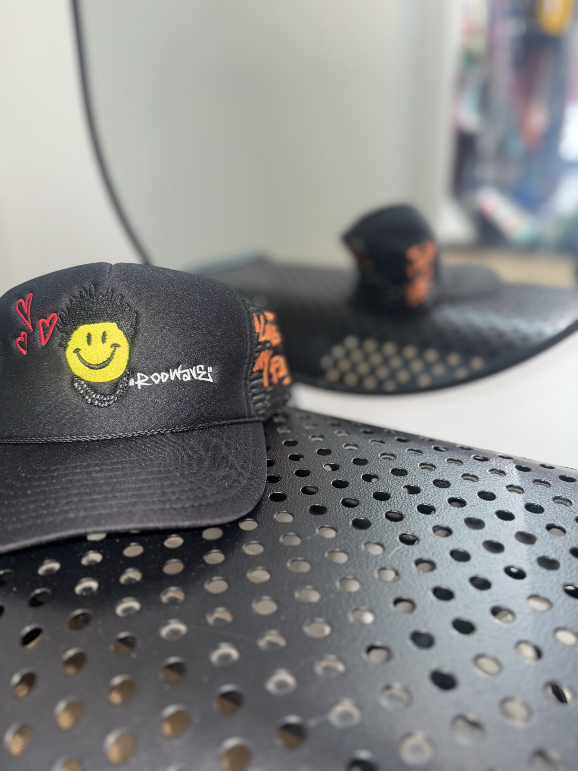 Make a bold statement with the RodWave Trucker Hat. Featuring a smiley face front graphic, “LOVE 4 MY FANS!” side embroidery, and a flaming broken heart on the mesh — this hat brings art, attitude, and authenticity to your everyday look. Adjustable snapback fit.
